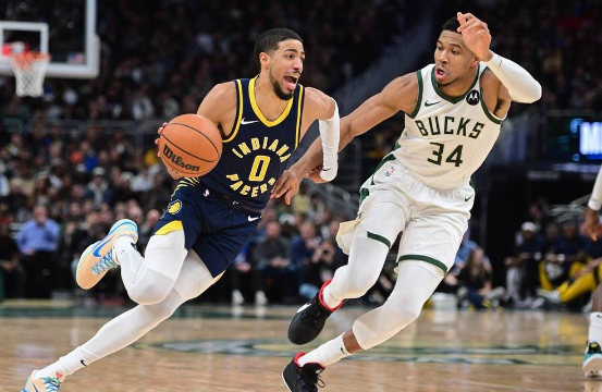 步行者队首发:泰瑞斯-哈利伯顿、迈尔斯-特纳、布鲁斯-布朗、巴迪-希尔德、奥比-托平